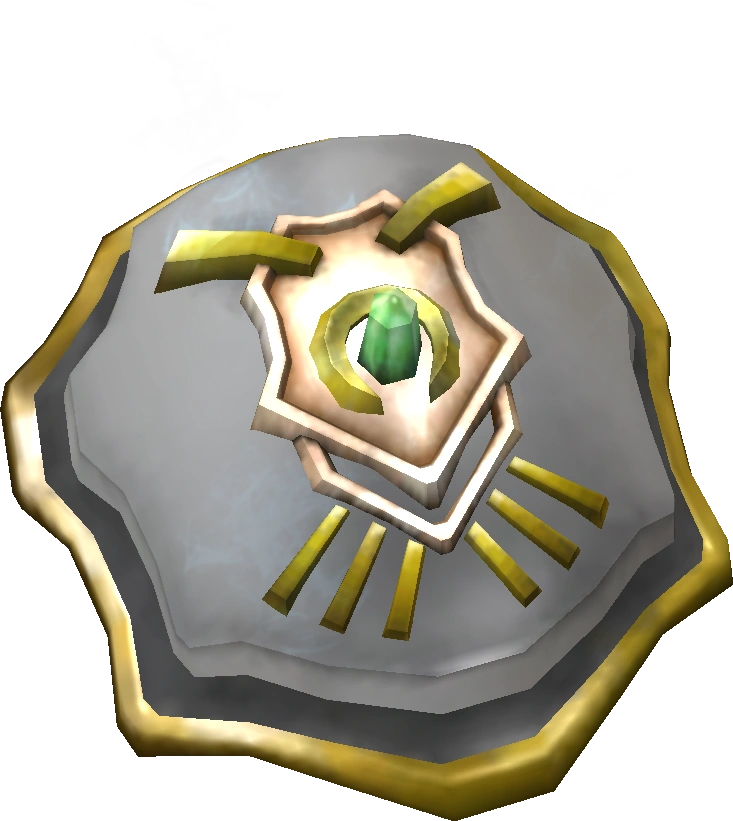 It is a gold trimmed metal plate that can be configured to be the shape of a shoulder/knee plate or shield using its sliders. There is a gem on the front that periodically pulses, as if emitting energy. It generates a visible shield around its wearer.