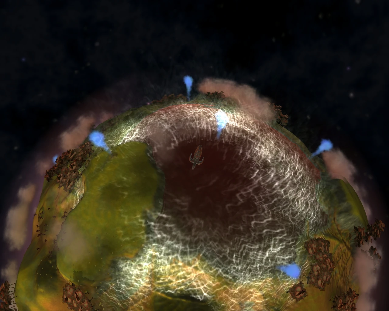Once launched, the projectile slowly moves down toward the ground, leaving behind a double helix trail. Upon impact, the atmosphere flashes then the primary explosion takes place. The explosion consists of white energy waves that intersect each other. As the wave propagates, it destroys all tribes or civilizations on the planet in touch. It cannot be used on a star system containing the player's homeworld or saved game.