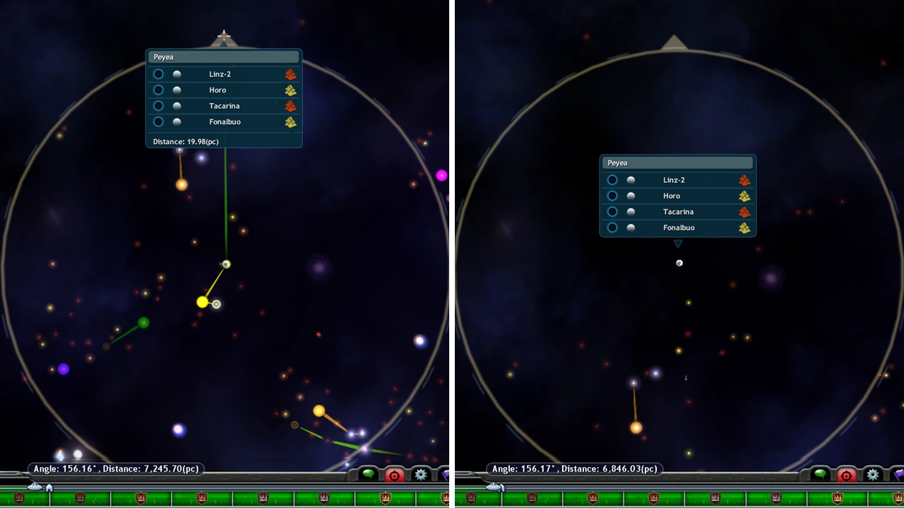 When hovering one's cursor over the spaceship icon, the distance to the center of the galaxy displayed is exaggerated by a factor of 20 when compared to the distance shown by hovering the cursor over a nearby star. For example, if one travels 20 pc to a star in the direction of the Galactic Core, then the distance to the core shown in the bar below will decrease by 400 pc accordingly.