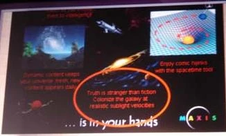 During an interview with Gaming Steve, Will Wright used a gravity tool to bend space-time. He stated that gravity was fully simulated in Spore and that most types of celestial bodies could be found in the Spore galaxy. He referred to other tools for creating planetary systems, but he did say that a star or a nebula could be formed simply by moving the mouse. Due to images from the 2006 GDC Presentation, it seemed likely the end-user would have had access to these tools. The image on the far right has the caption "Enjoy cosmic hijinks with the spacetime tool.".