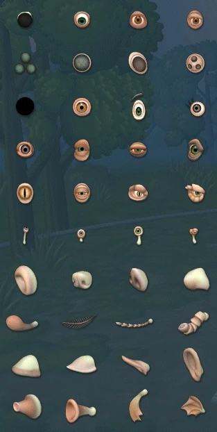 The parts of the last 4 rows include additional sensory organs that do not grant any ability. The same parts in the Spore Creature Creator grant the Charm ability.